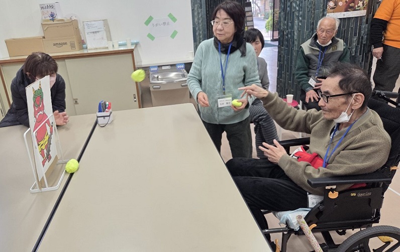 五十嵐さんは何回もやっているのでとても上手に鬼をやっつけていました。船越さんは初めてでしたが勢いよく鬼めがけて豆を投げ、しっかり鬼を倒していましたよ。早苗さんは机の上の鬼に投げるのが難しようでしたので、床に置いた鬼をやっつけてくれました。みんなで鬼をやっつけたので、きっと福の神が安心してやってくることが出来るでしょうね。